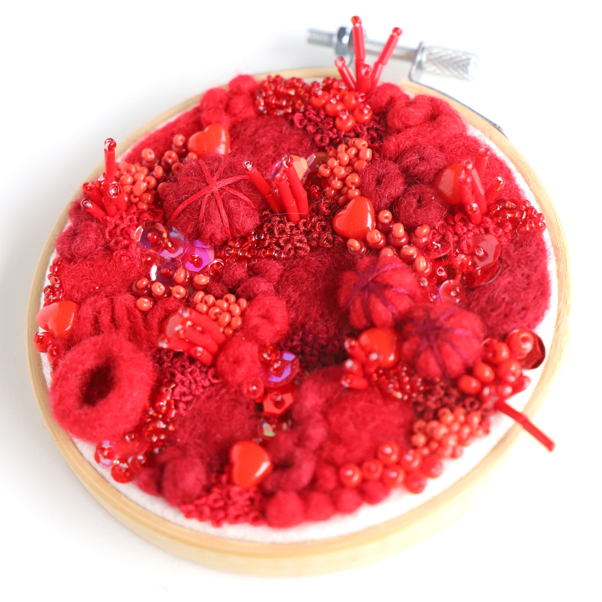 Jump into embroidery, needle felting, and beading with my updated best seller kit! This kit is inspired by the colors of Taylor Swift's "Red" Era! Complete with 13 heart beads and wool, threads, and beads in every shade of red you could imagine.